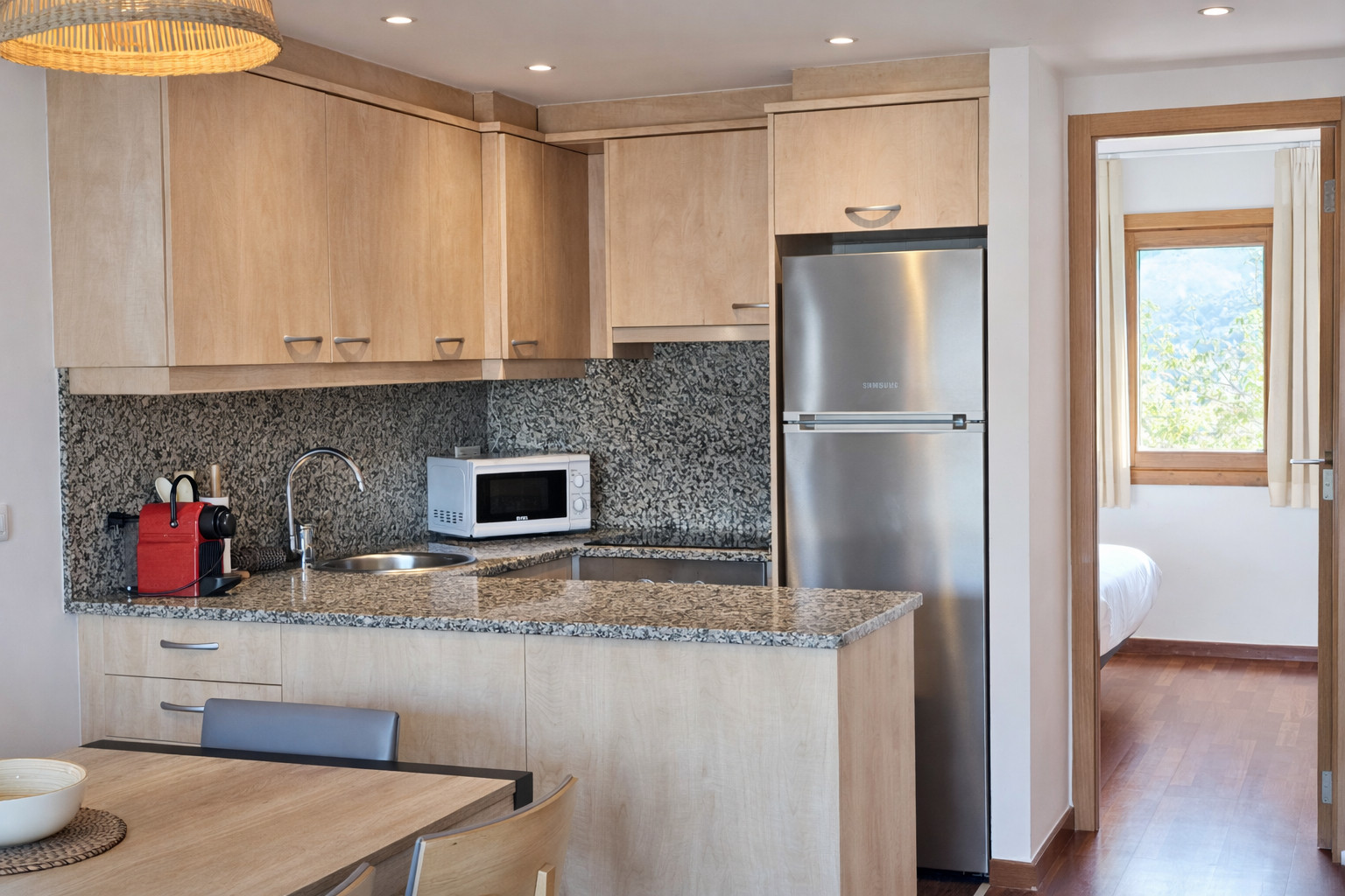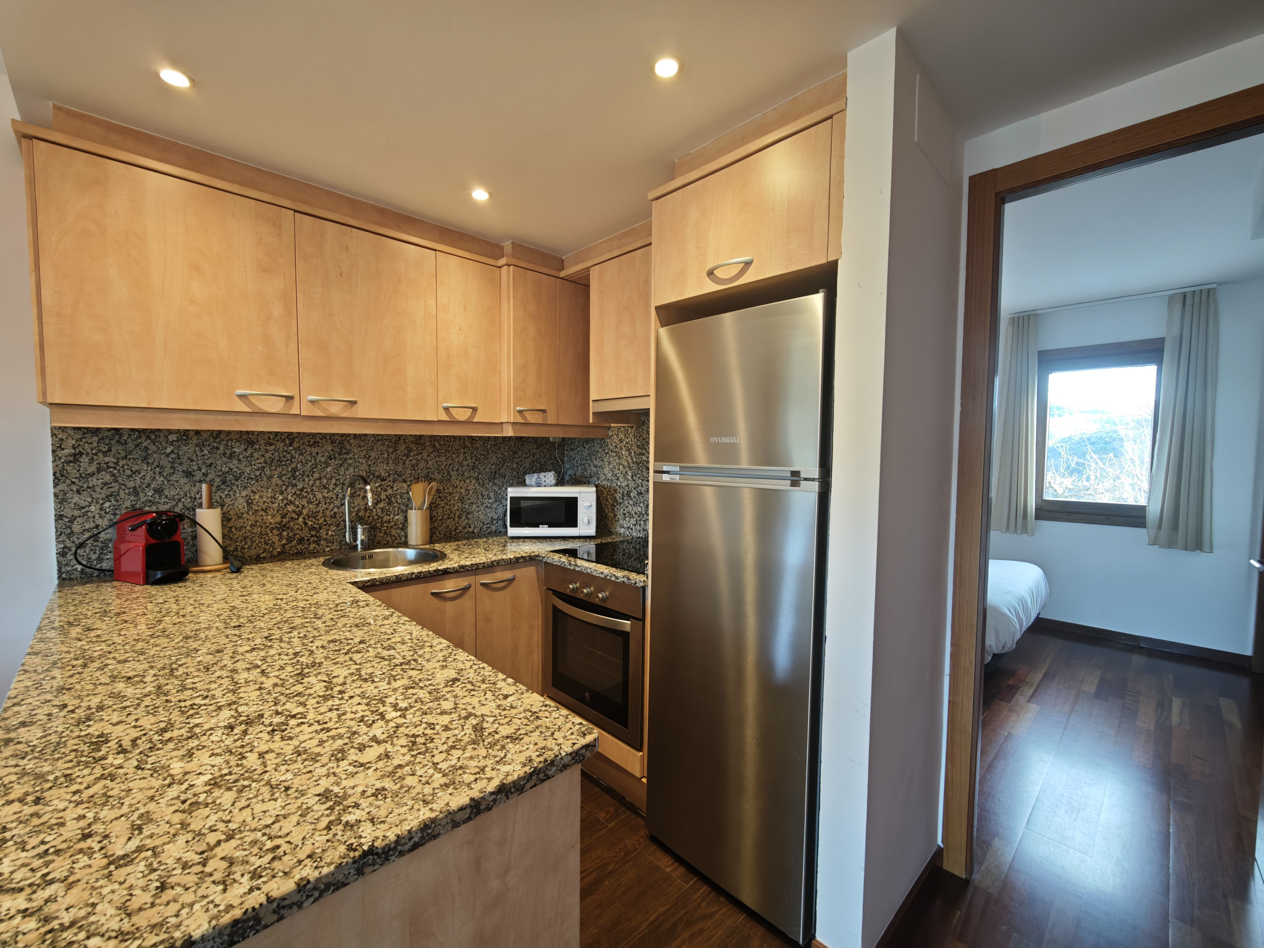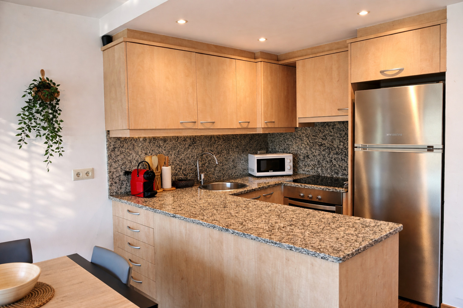 Cocina abierta totalmente equipada (lavavajillas, horno, microondas, vitrocerámica, nevera-congelador)