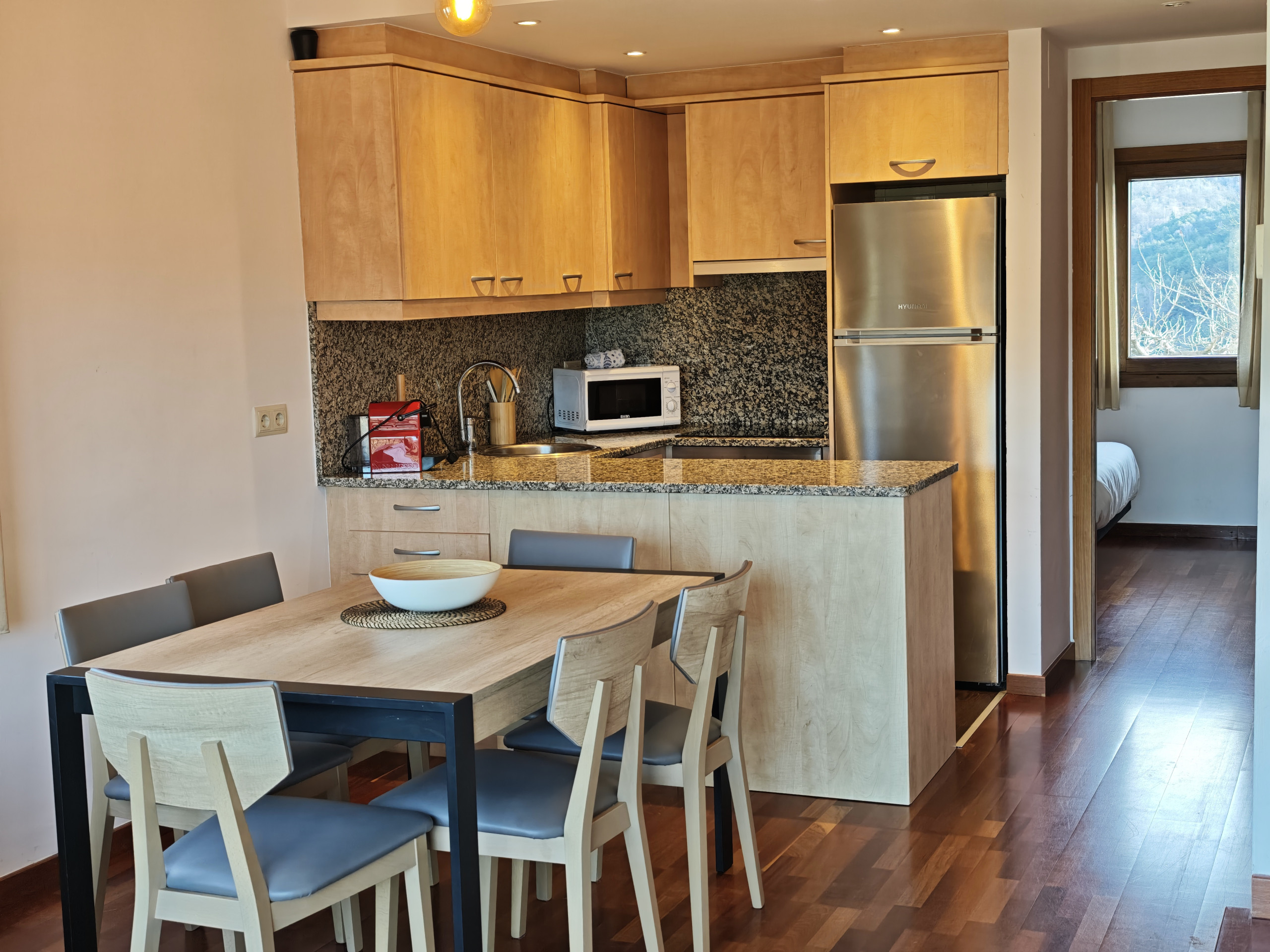 Cuina oberta totalment equipada (lavavaixelles, forn, microones, vitroceràmica, nevera-congelador)