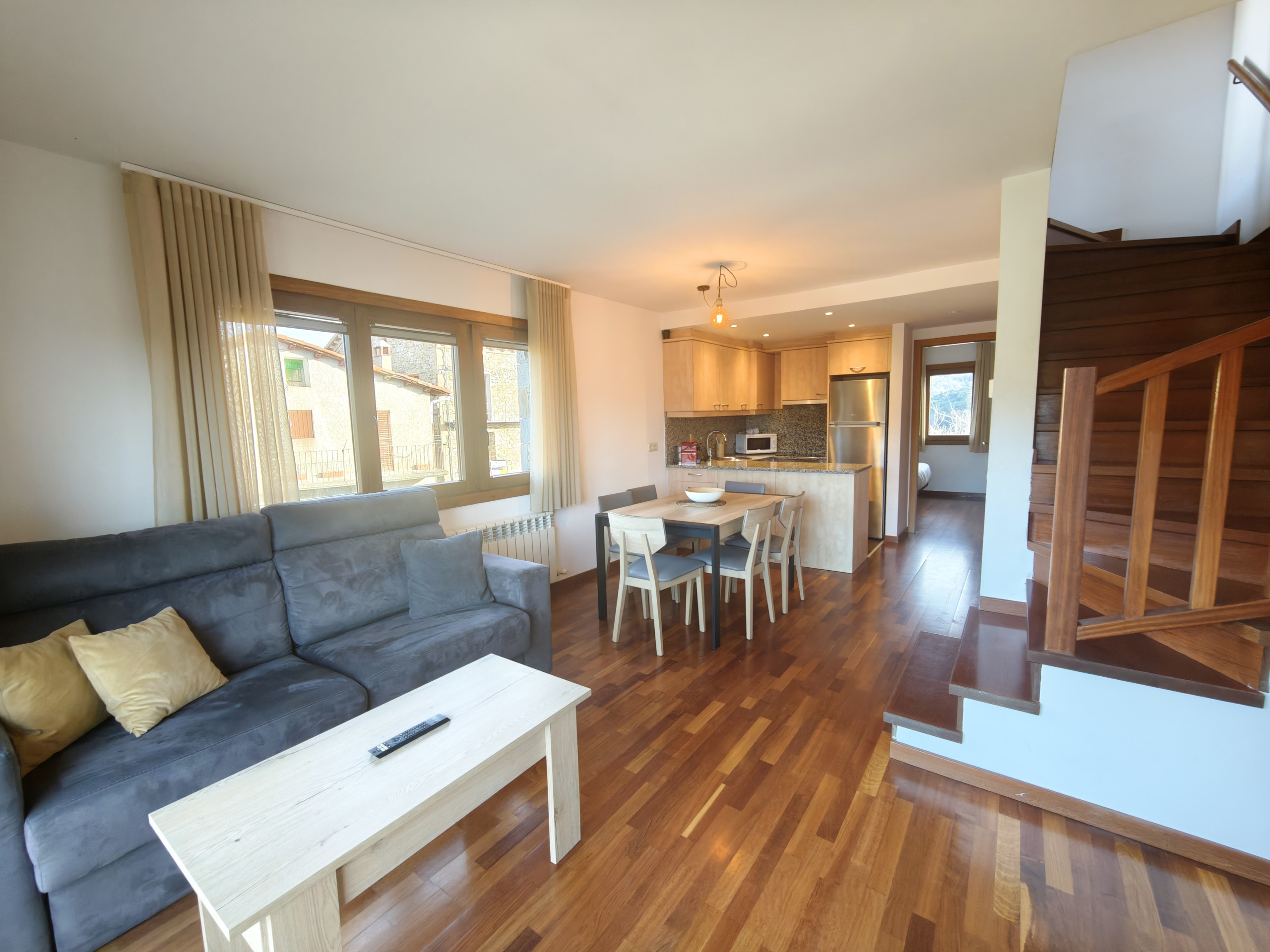 A la primera planta, trobaràs un dormitori amb una cama de matrimoni de 1,5 m, ideal per descansar després d'un dia d'aventures. El bany complet inclou una banyera i un assecador de cabell. La cuina oberta està totalment equipada amb lavavaixelles, forn, microones, vitroceràmica i nevera-congelador, proporcionant tot el necessari per cuinar còmodament. El saló compta amb un sofà-llit doble, Smart TV, Wi-Fi, una acollidora xemeneia i un balcó amb vistes per gaudir de l'aire lliure.
