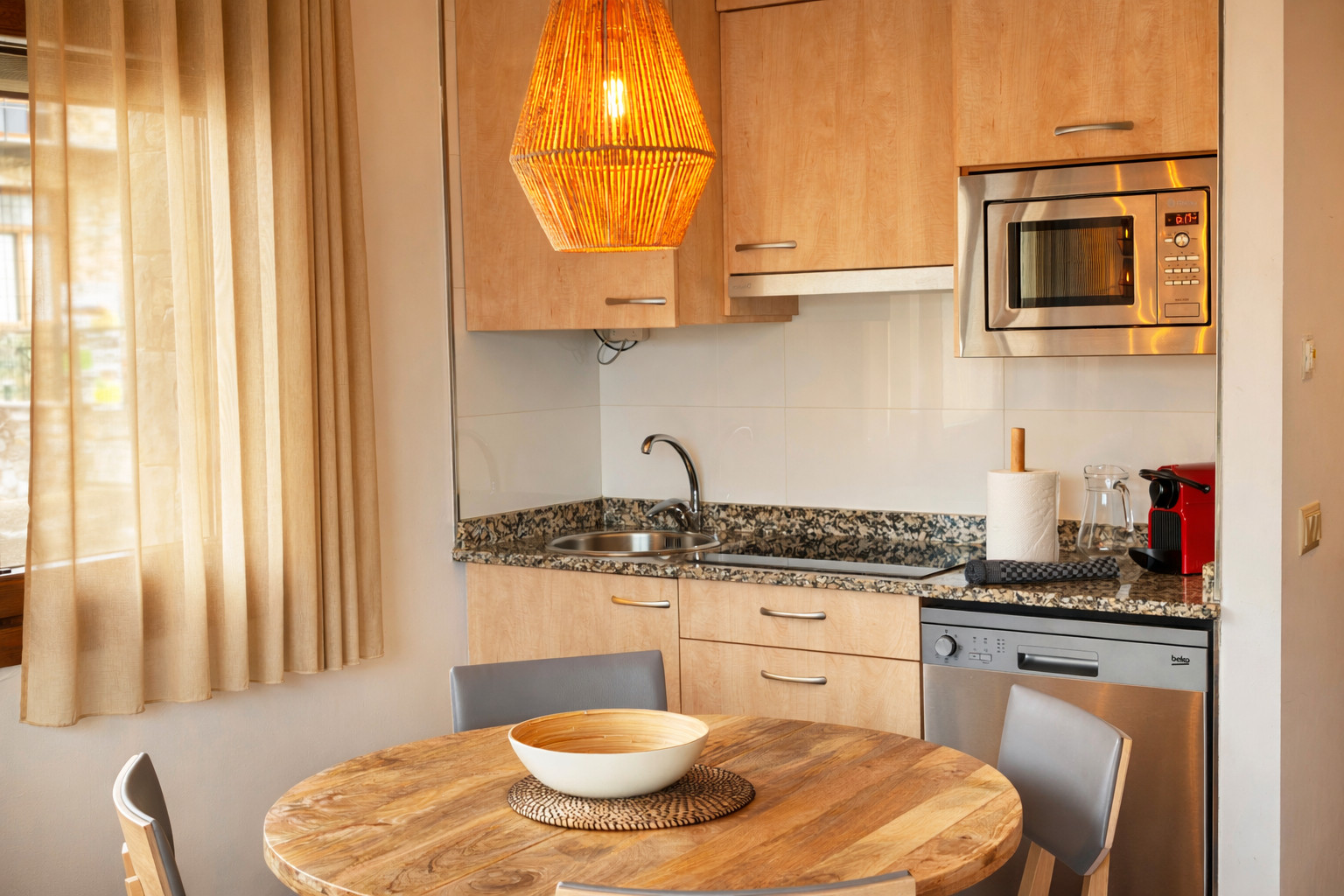 Cuina oberta totalment equipada, amb vitroceràmica, microones, nevera-congelador, cafetera Nespresso, torradora i parament